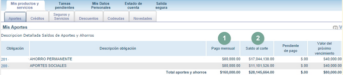 En la pestaña de Aportes usted podrá consultar los saldos de sus productos de ahorro en la columna